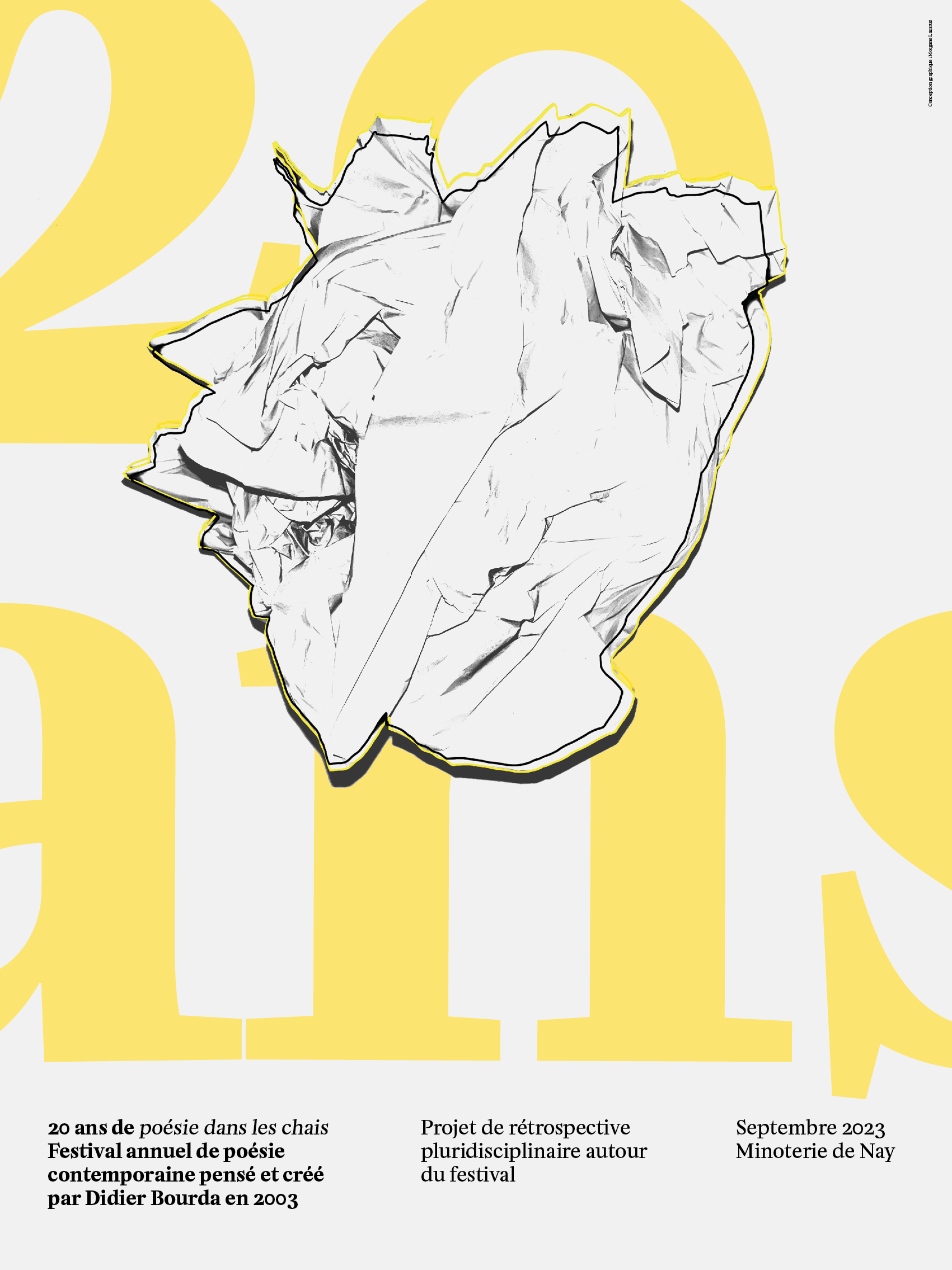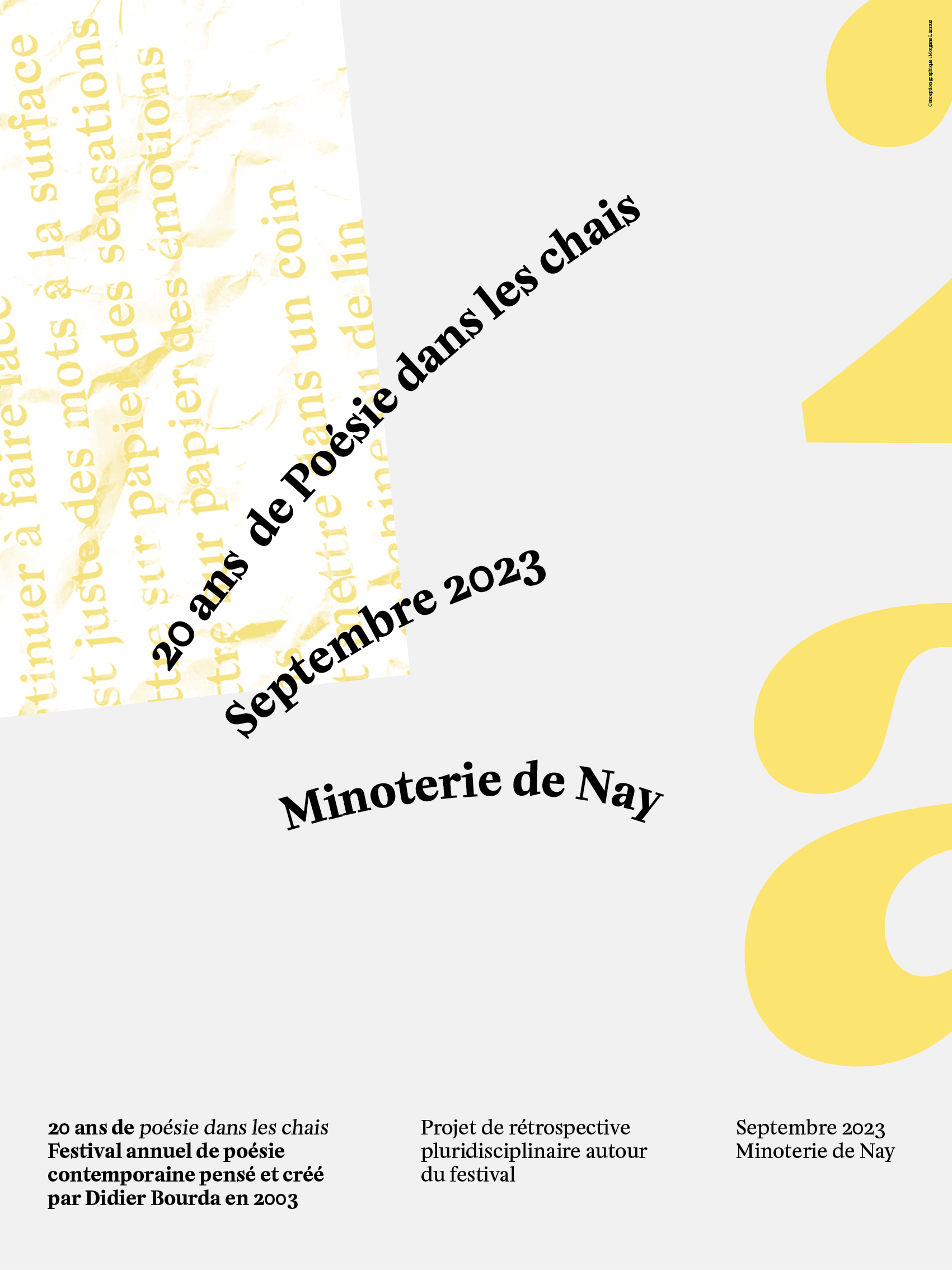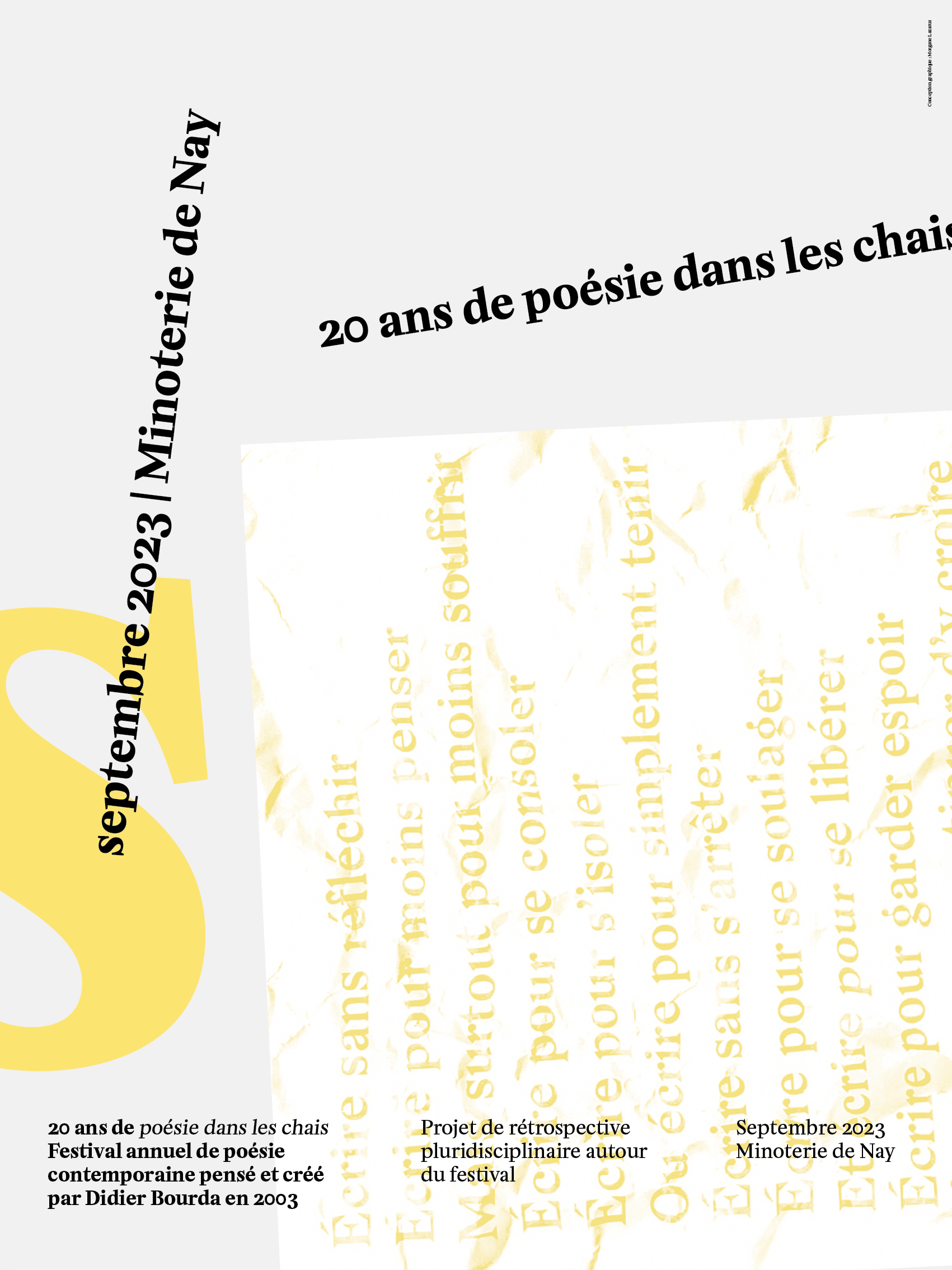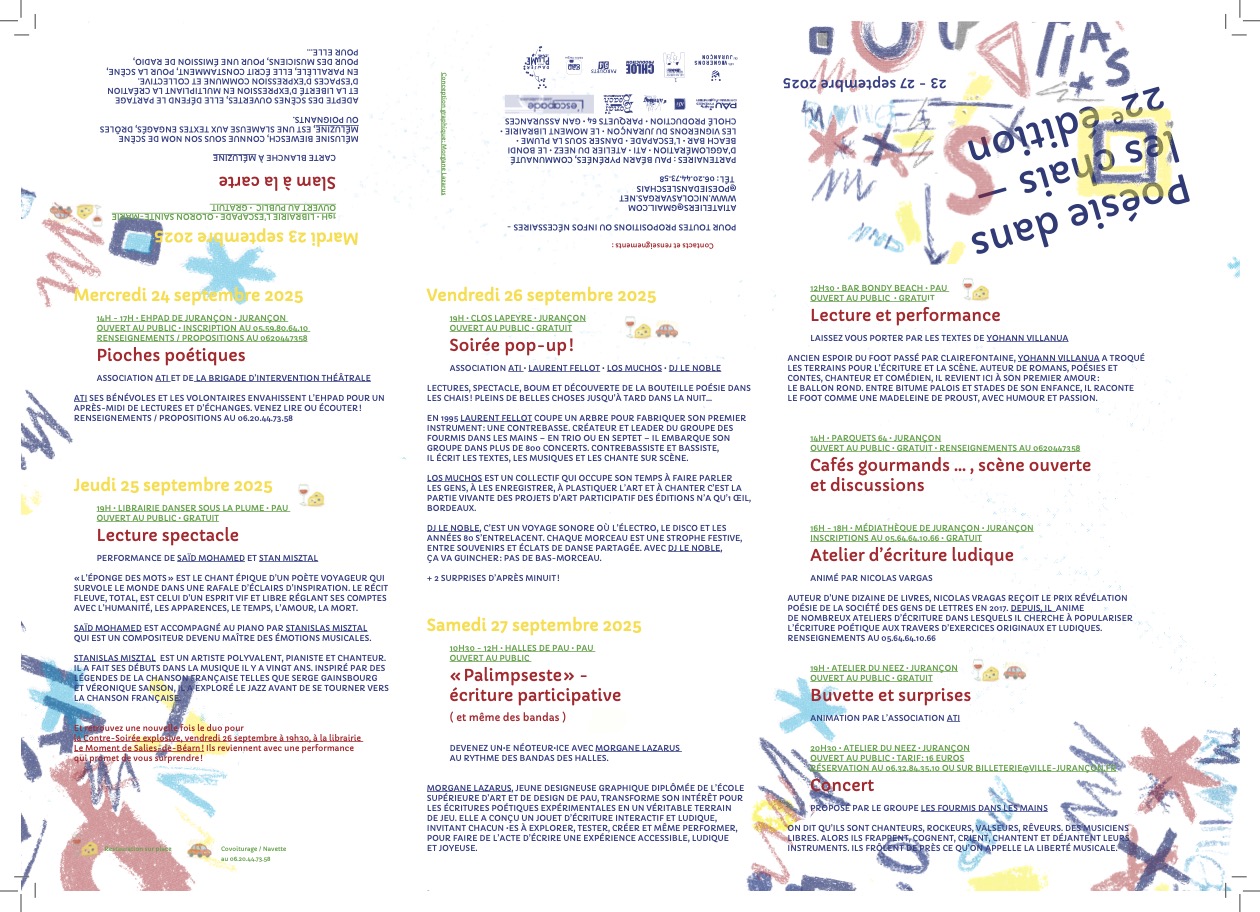 Affiche réalisée à l'occasion du festival de Poésie dans les chais 2024 Programme au verso de l'affiche et travail de pliage / façonnage pour créer un petit objet éditorial.