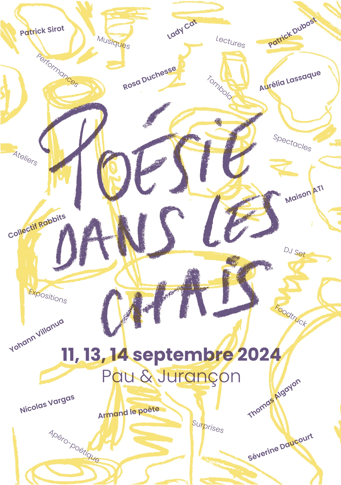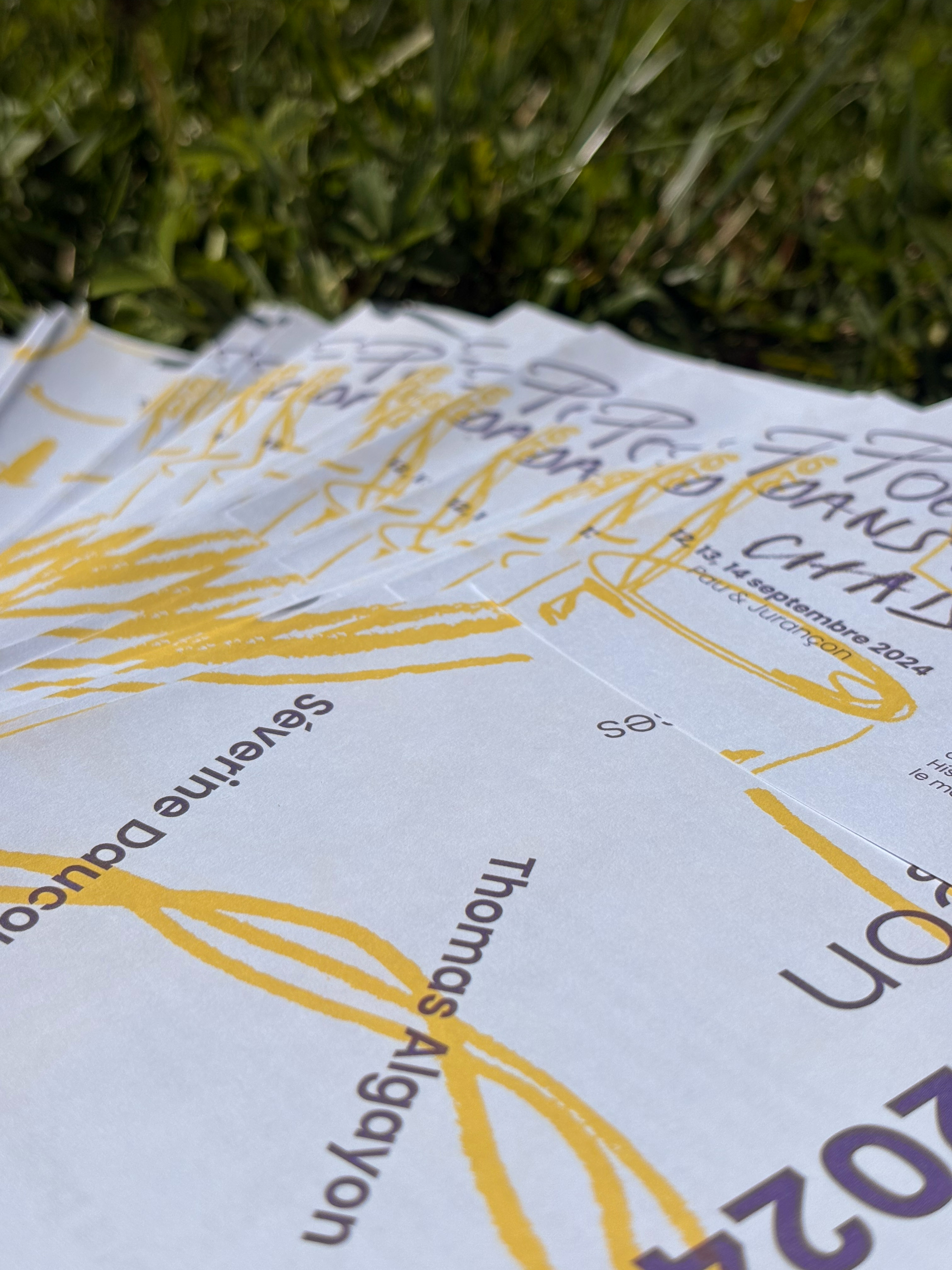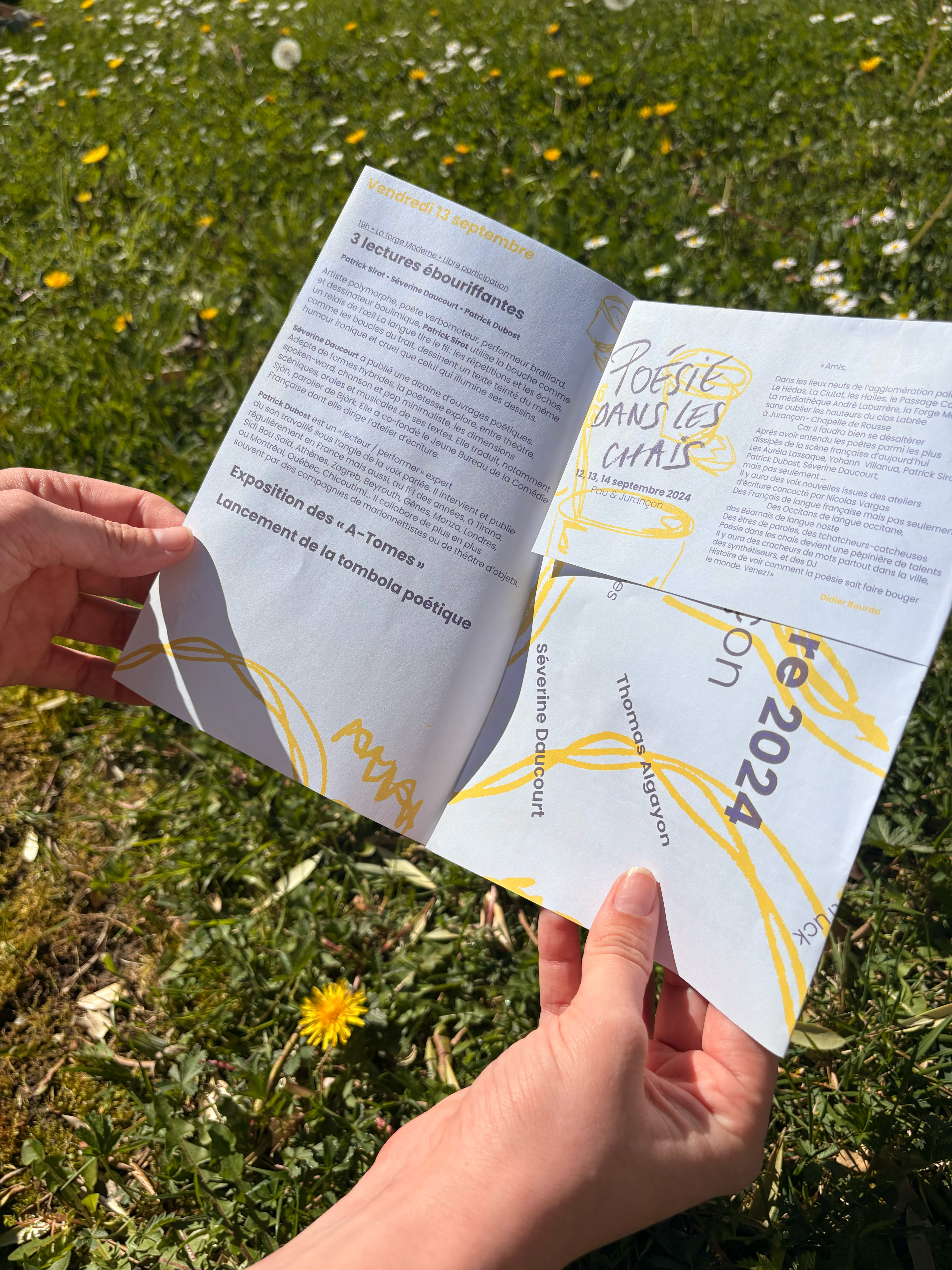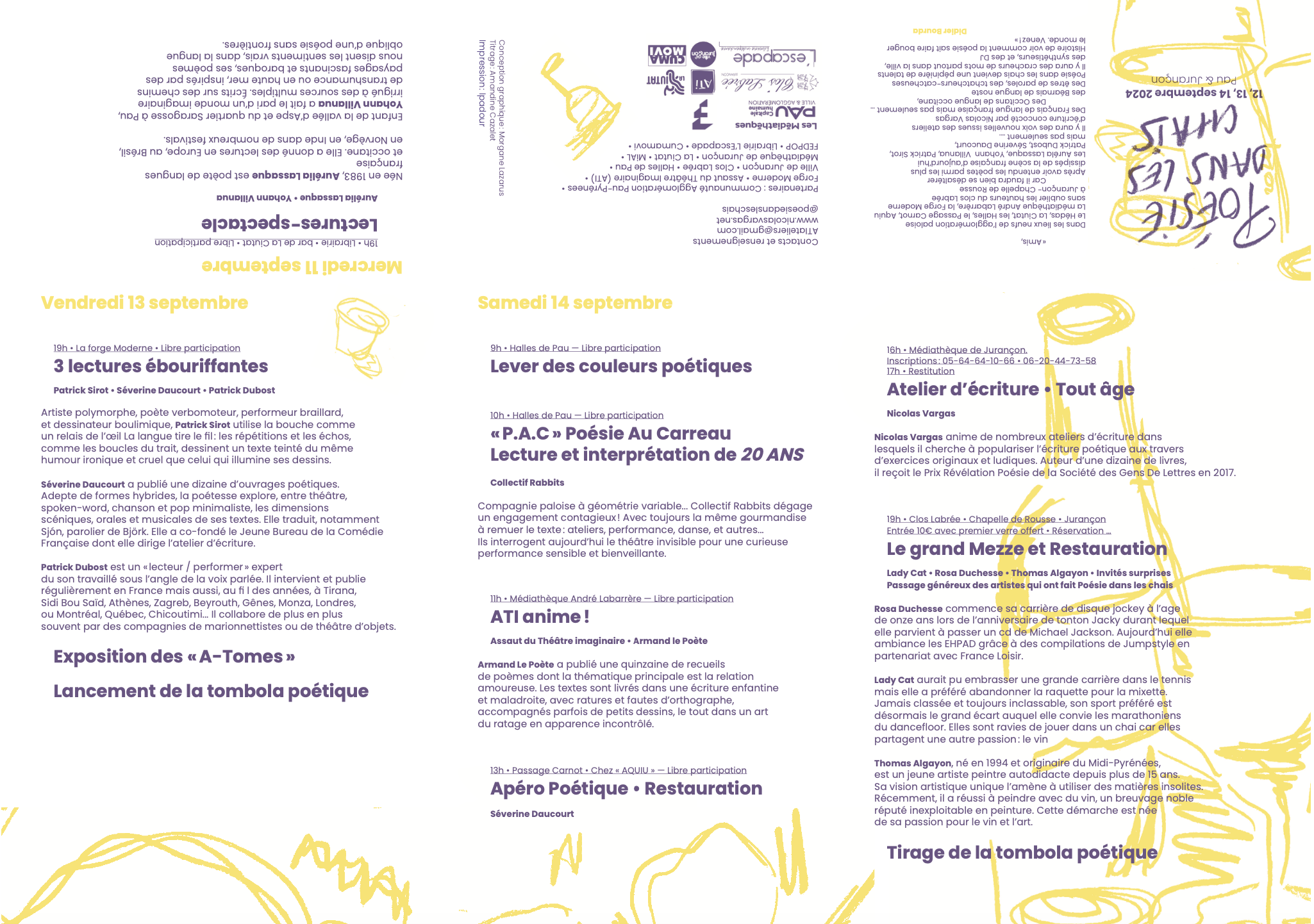 Affiche réalisée à l'occasion du festival de Poésie dans les chais 2024 Programme au verso de l'affiche et travail de pliage / façonnage pour créer un petit objet éditorial.