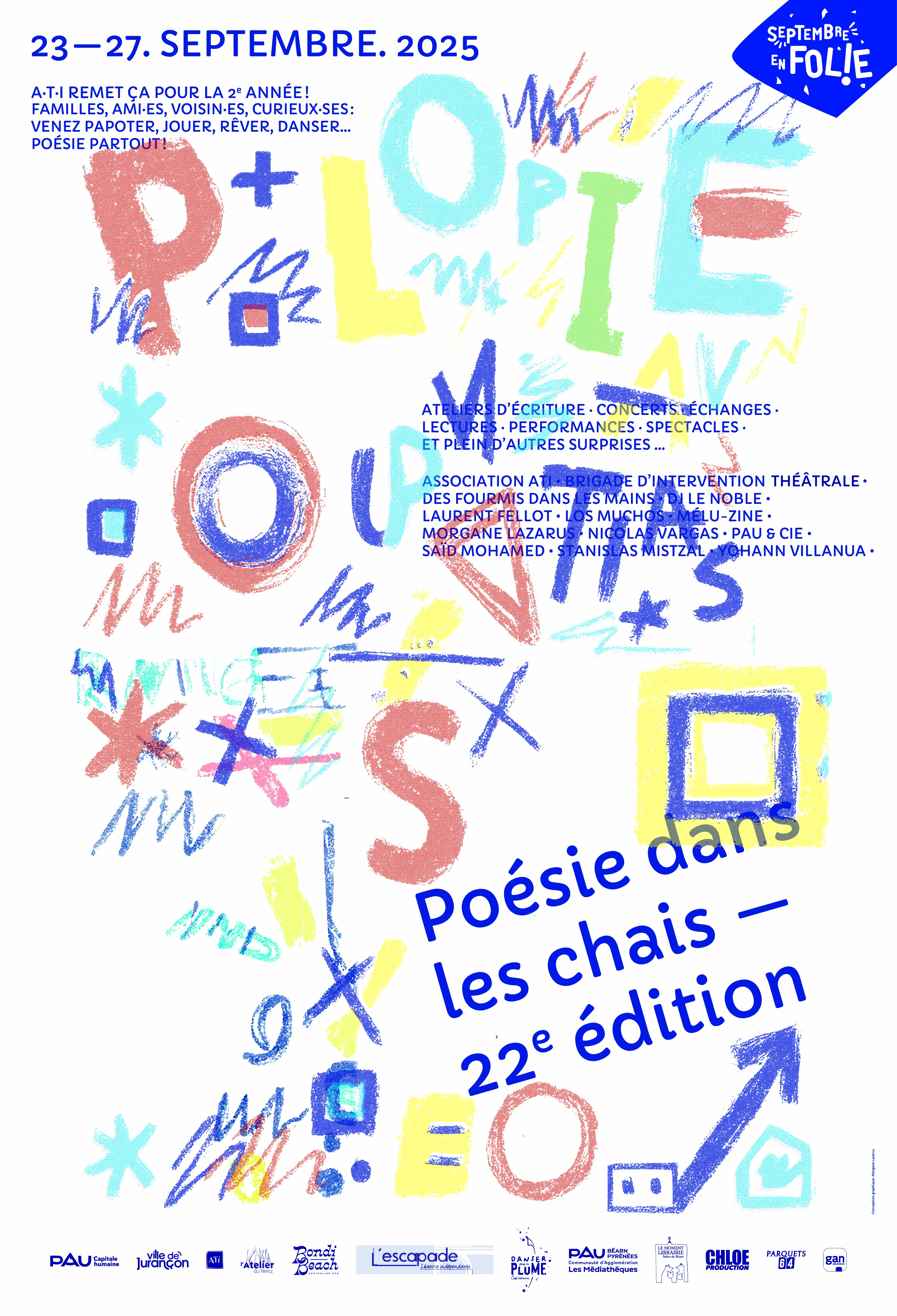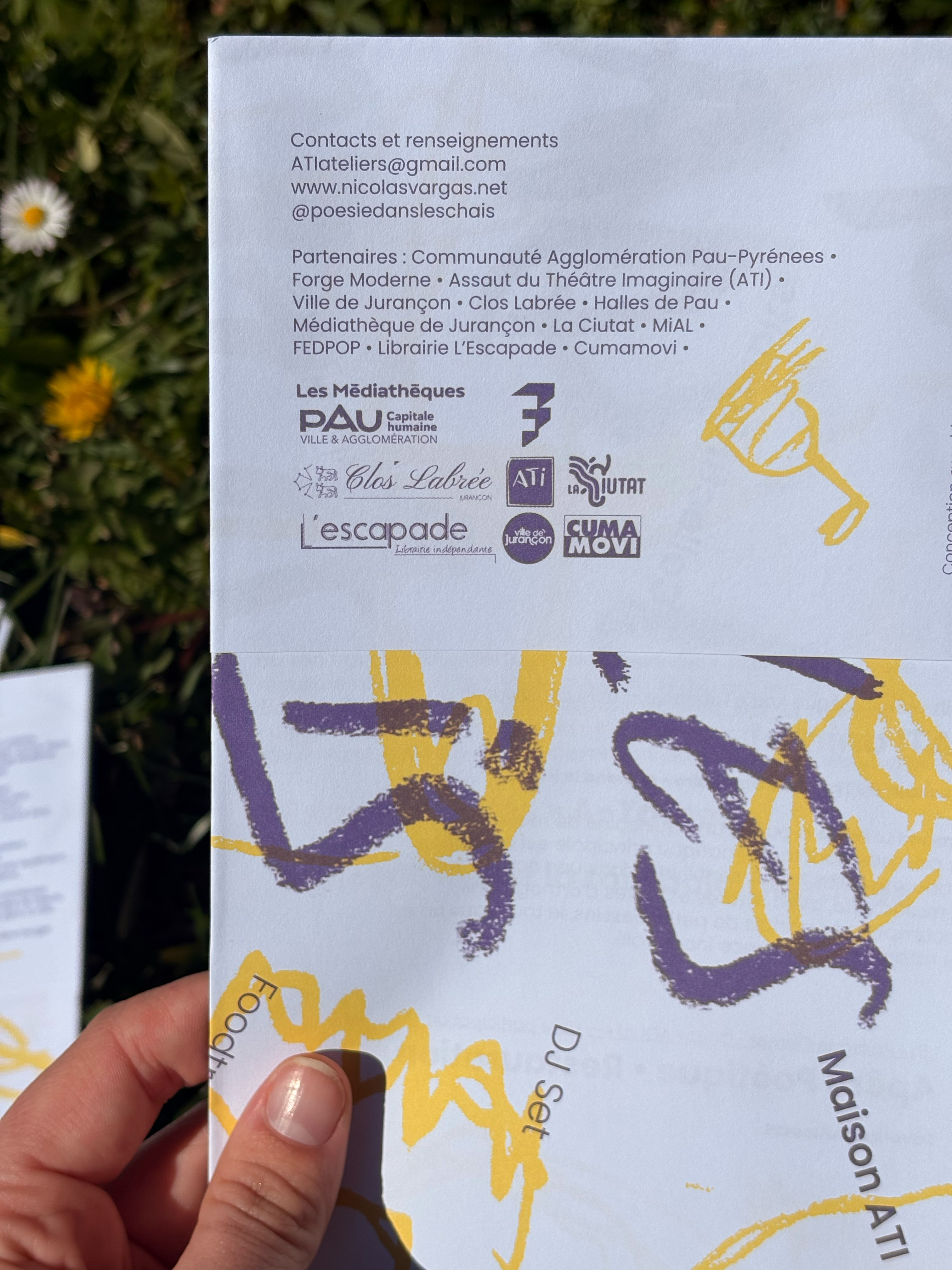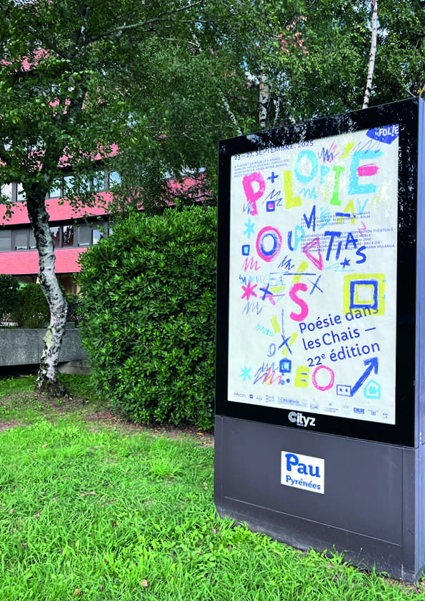 Affiche réalisée à l'occasion du festival de Poésie dans les chais 2025 Programme au verso de l'affiche et travail de pliage / façonnage pour créer un petit objet éditorial.